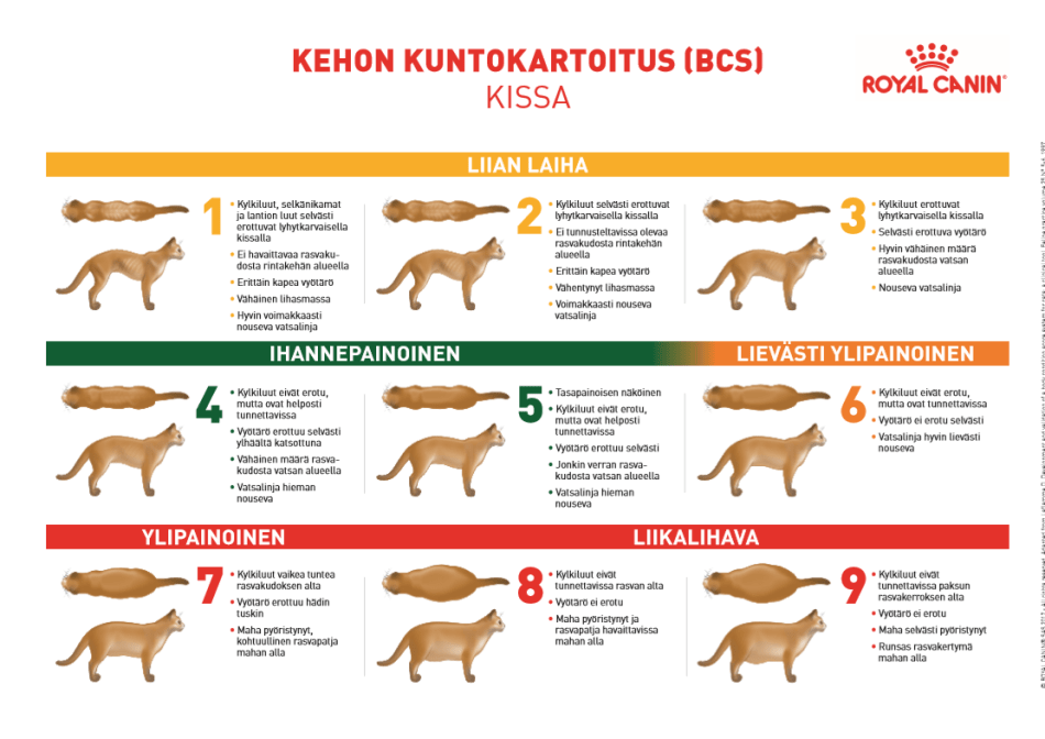 Alla olevan ohjeen mukaan voit arvioida oman kissasi kuntoluokan.