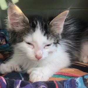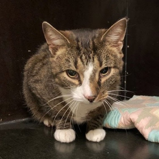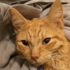 Tämä kissa kyyhöttää raajat ja häntä kehon alla. Korvat ovat suuntautuneet sivuille, silmäluomet puoliksi kiinni, suun ympärys jännittynyt, viikset jännittyneet ja eteenpäin suuntautuneet, päähartialinjan tasalla.