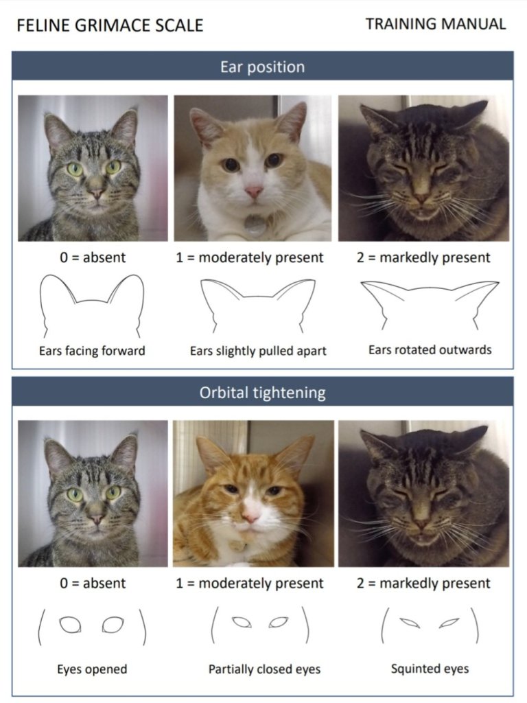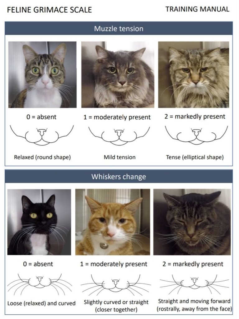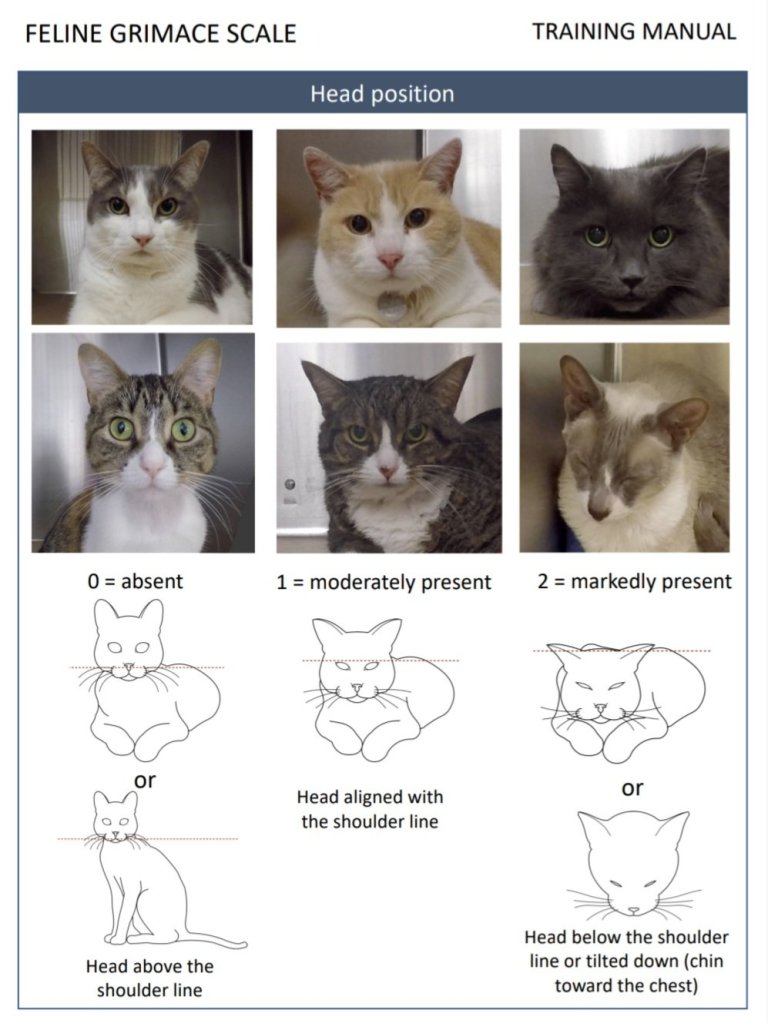 Kivun voimistuessa korvat kääntyvät sivulle ja korvien kärjet erkanevat toisistaan, silmäluomet menevät ensin puoliumpeen ja sitten kokonaan kiinni ja katse kääntyy ikään kuin sisäänpäin, suun ympäristö jännittyy, viikset suoristuvat ja suuntautuvat jäykästi eteenpäin ja pää laskee hartialinjan tasalle tai sen alle. Mitä voimakkaampia muutokset ovat, sitä voimakkaampaa kipua kissa tuntee.