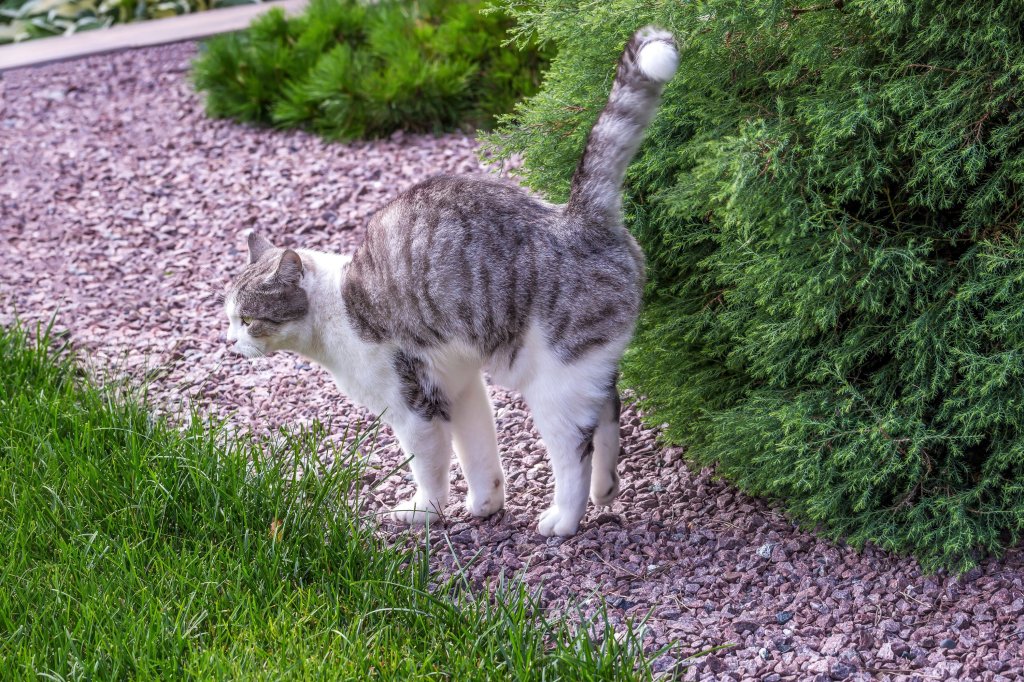 Merkatessa kissa suihkuttaa virtsaa seisten häntä pystyssä ja se usein myös steppaa takajaloilla ja värisyttää häntää.
